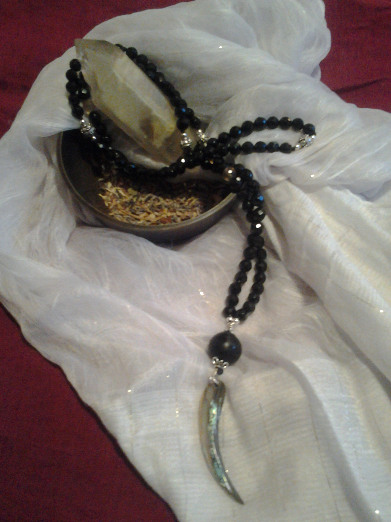 Prayer beads have been used across time and culture to be a tool for Body, Spirit and Mind. Buddhism, Hinduism and Sikhism utilize a string of 108 beads to keep pace the mantras of the heart manifesting its deepest desires. As a mathematician, the unit of 108 itself holds immense beauty and reflection. This simple strand keeps space, time and mystery for our mind. Of the 108, three beads were selected to stand apart-the Mothers. They are the deep cycles of our unconscious, randomly threaded into the mala. Reflection upon them yields visions of perfection even in the appearance of Chaos.